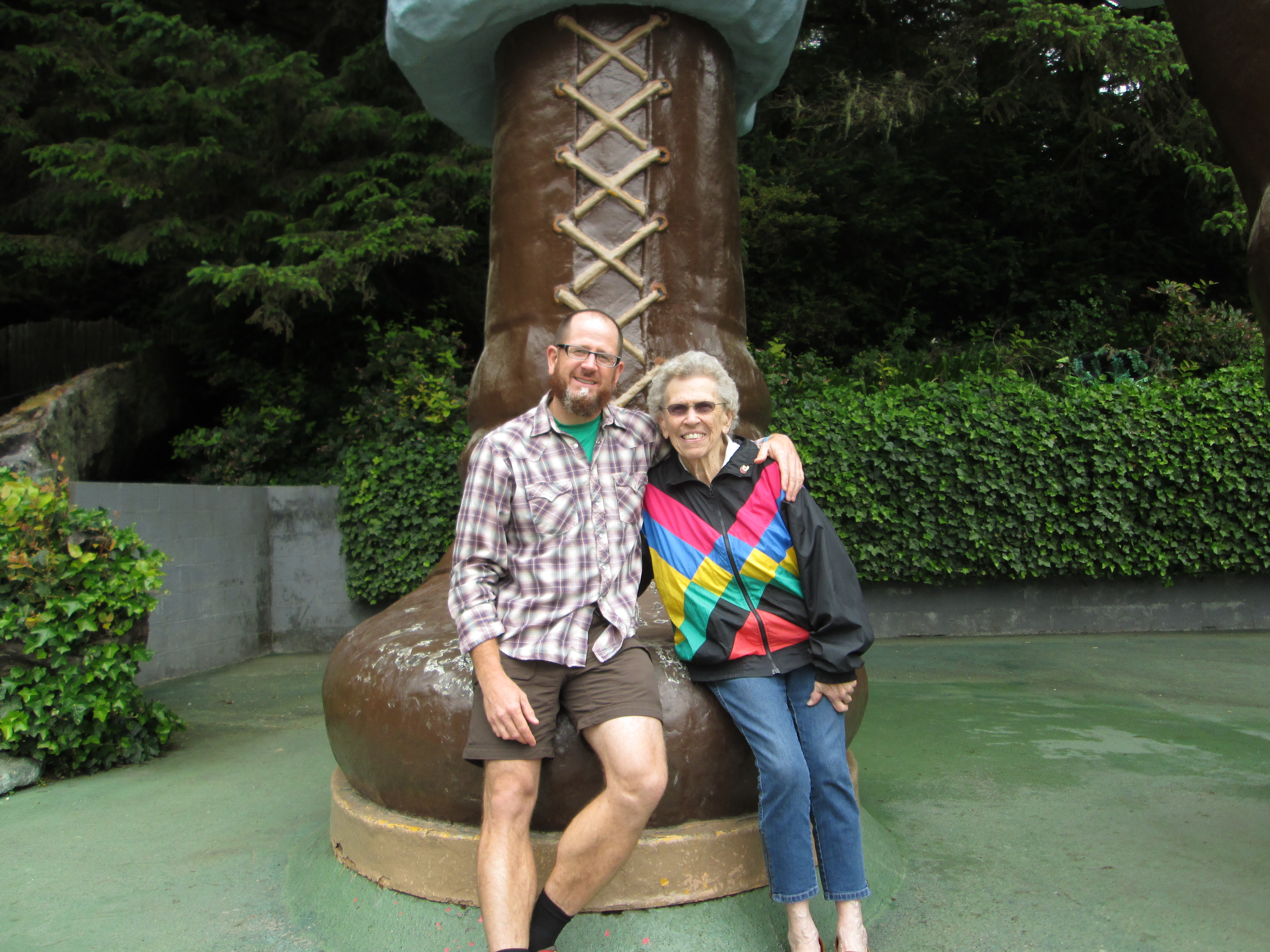 We reminisced about our stop at the Trees of Mystery in Klamath.  How that giant Paul Bunyan and his Ox stand out in my childhood mind as one of the most glorious places a kid could possibly visit.  Maybe it’s something about Paul’s giant, shiny brown boots and that you can sit on them.  Maybe it’s the house-sized axe slung over his shoulder.  But today I was not impressed.  And further dismayed by the fact that Paul now talks and his voice sounds like that of a high school sophomore.  I expressed my disappointment aloud, saying, “This is totally weird,” and was refuted by Paul.  “This is not weird,” his voice cracked.  “Let’s take our photo together.”  A young couple was taking turns snapping iPhone pics, no doubt for their Facebook pages, with Babe’s giant blue testicles.  So I supposed reliving my youth a bit and hopping up on Paul’s instep wouldn’t be a big deal.