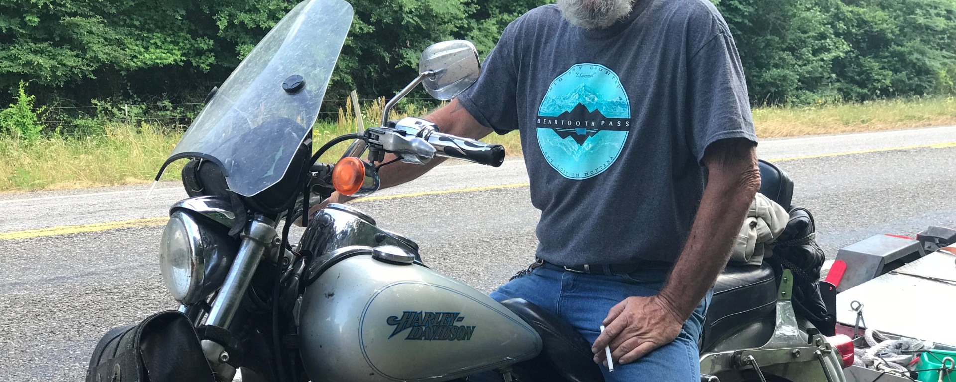 Twice I notice the same thunderous motorcycle with a trailer attached. It goes toward Gilmer, TX and then away from it. The third time the rider flashes me a peace sign then turns round. Slows on the shoulder beside me.