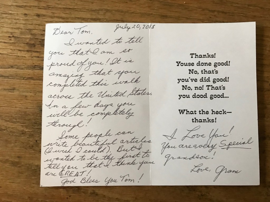 The answers to the most common questionsMy short-lived podcast (we only made it through day 72) CLICK HERE to listen to episodes 1-26Started with the Brooks Cascadia, then wore the HOKA Bondi for the final 6 pairsCoins found on the ground (~$22 and some pesos)License plates found along the wayThe little wooden home Katie gave me when I startedThe little wooden home and other walk tokens after 3000 miles in my pocketPocket knives found across 14 statesSpoons I picked up across America Curious what I listened to along the way? CLICK HERE for playlist of what I sang along toCard from my GramThe EndCork in the bottle CLICK HERE for a video from my return to Santa Monica pier